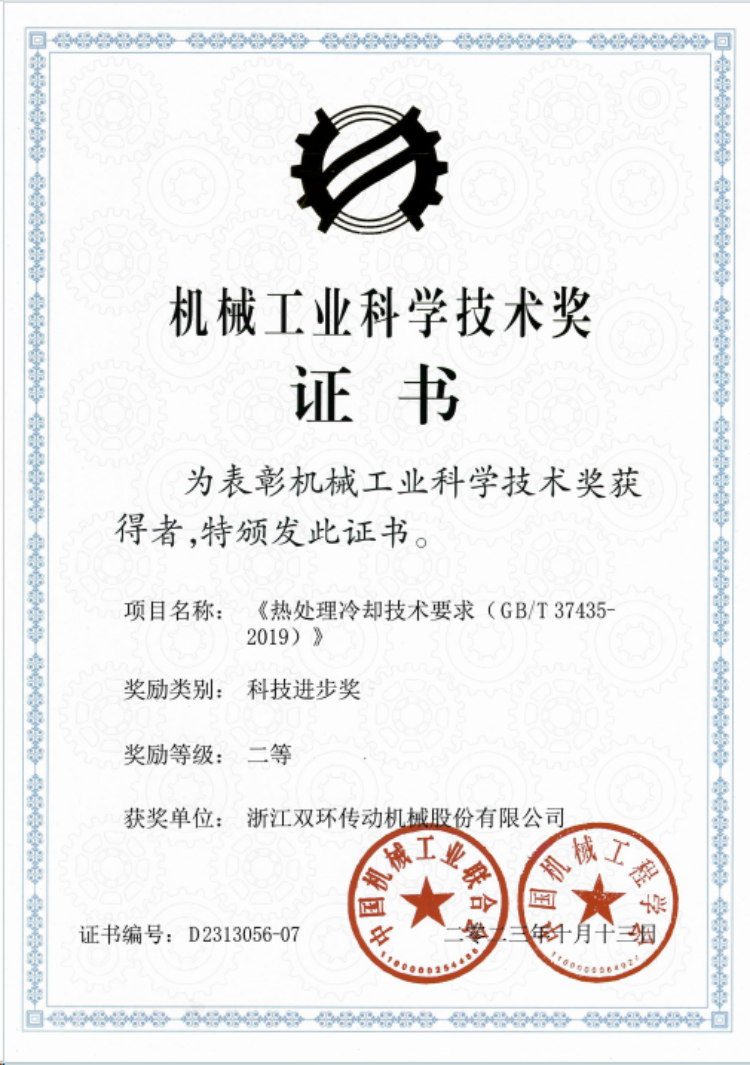 日前,2023年度“机械工业科学技术奖”颁奖大会在大连召开,由双环传动参与制定的国家标准“GB/T37435-2019热处理冷却技术要求”项目荣获国家科技进步二等奖。