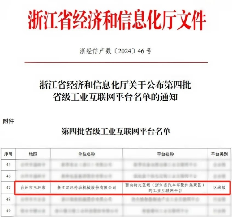 近日,浙江省经济和信息化厅发布《关于公布第四批省级工业互联网平台名单的通知》,双环传动《面向特定区域(浙江省汽车零配件集聚区)的工业互联网平台》项目成功入选。这是对双环数字化建设工作的充分肯定,将进一步推动公司实现数字化转型发展。