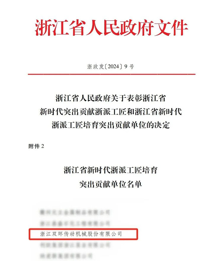近日,省政府印发《关于表彰浙江省新时代突出贡献浙派工匠和浙江省新时代浙派工匠培育突出贡献单位的决定》,双环传动成功入选“浙江省新时代浙派工匠培育突出贡献单位”名单!该奖项为省政府首次组织评选,以进一步擦亮“浙派工匠”的金名片。作为首批成功登榜企业,双环传动在各级政府的关心关怀和支持下,工匠培育工作硕果累累,受到高度认可。