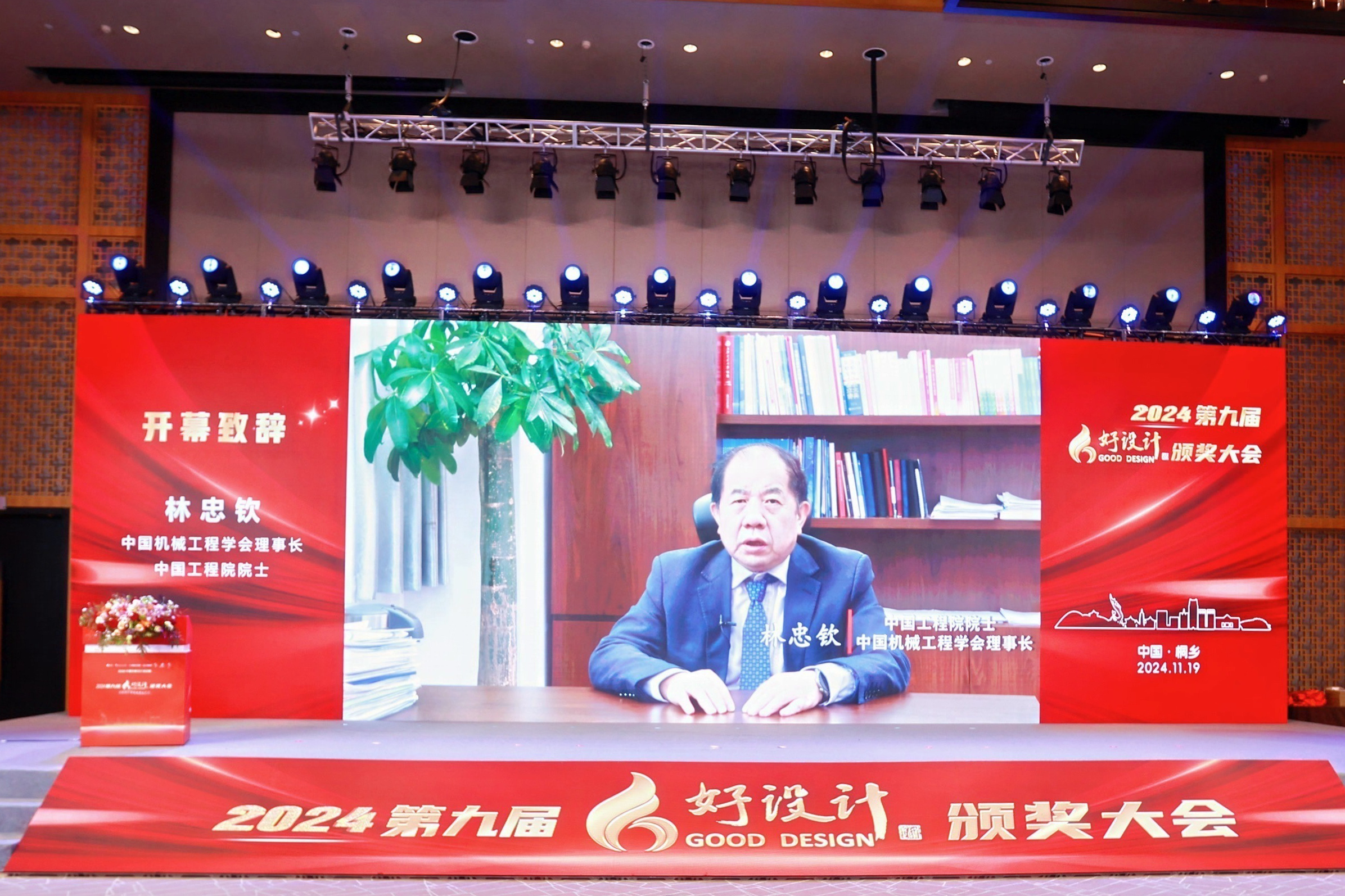 中国工程院院士、中国机械工程学会理事长林忠钦通过视频为大会致辞。他代表中国机械工程学会向浙江省、桐乡市各级政府给予的大力支持表示衷心感谢,向获奖项目单位和设计师们表示热烈祝贺。