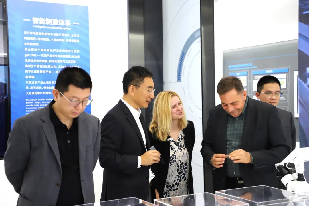 在双环领导的陪同下,Pócs János先生一行先后前往双环本部、嘉兴双环两大齿轮生产基地以及科研基地双环研究院参观考察,详细了解了公司的发展历程、业务布局、技术创新成果、智能制造、未来战略规划等。