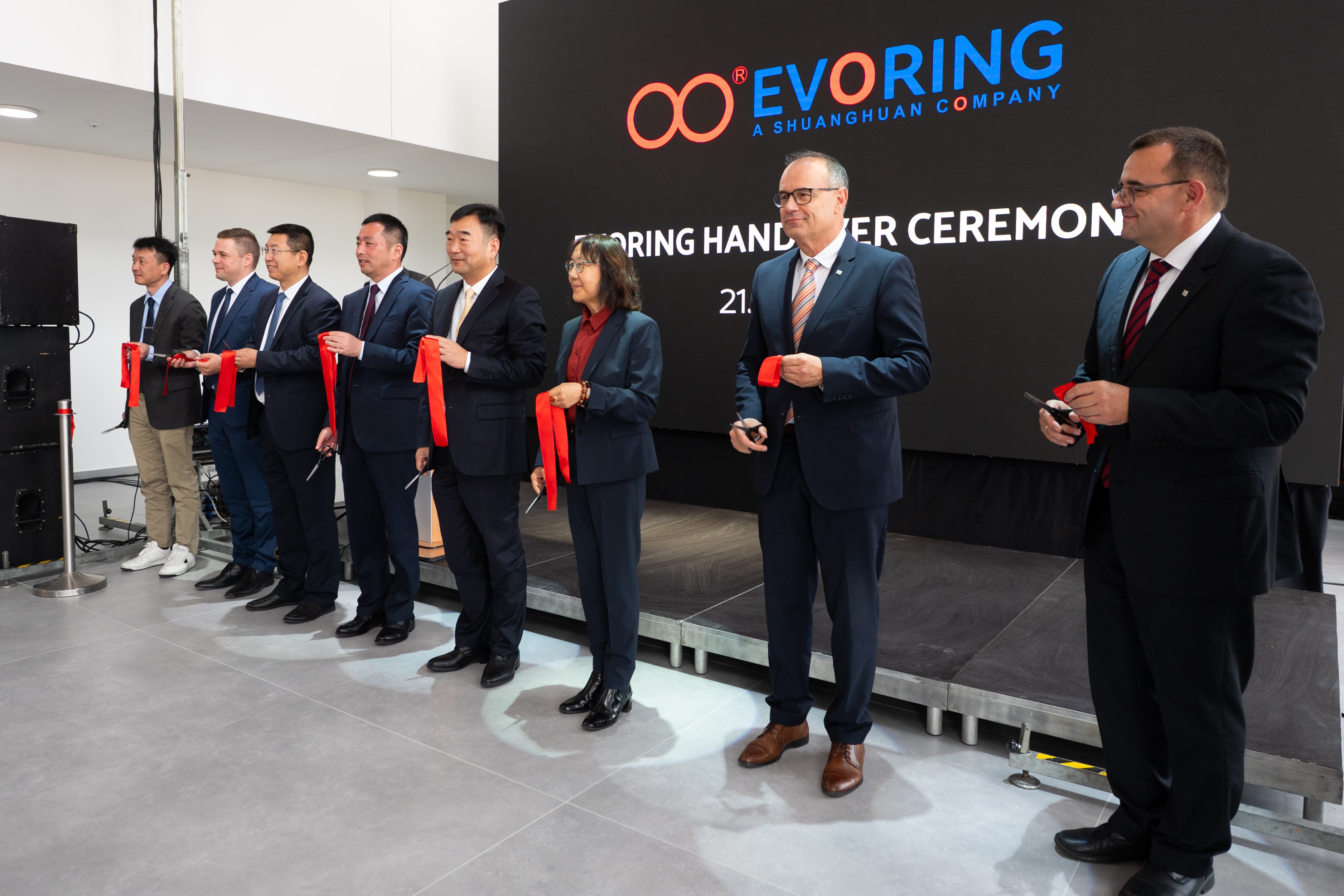 双环传动匈牙利子公司(EVORING)投资官宣暨奠基仪式于2023年11月17日举行,2024年3月,匈牙利工厂正式启动建设。工厂位于匈牙利亚斯费尼绍鲁市,贴近首都布达佩斯,工厂生产规模为2.4万㎡,在各方的共同努力下,在短短6个月的时间实现封顶,并于2025年5月21日迎来交付,已正式可为广大客户提供服务。