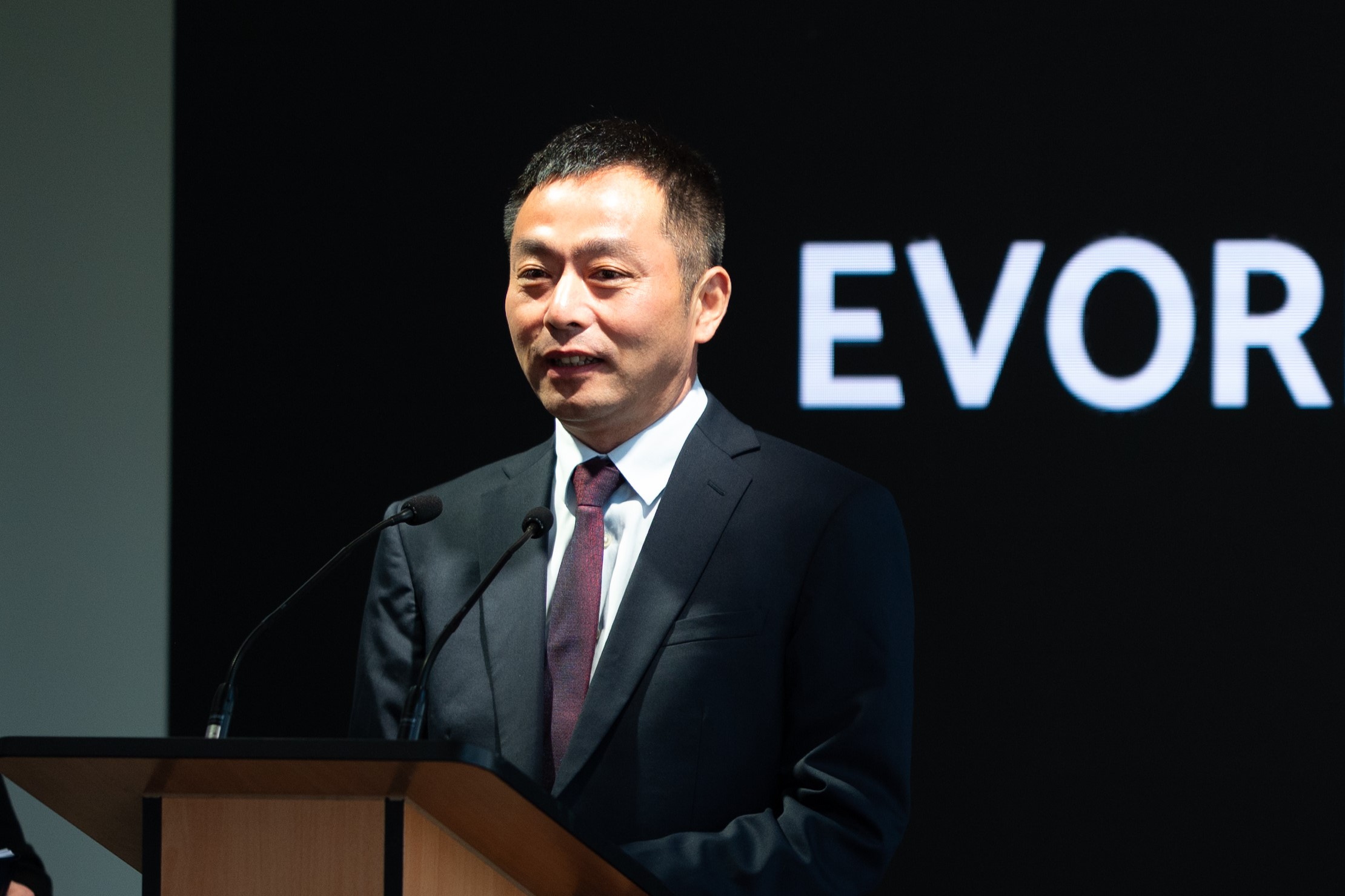 双环传动董事长吴长鸿发表致辞。他首先向远道而来的淮安区政府一行、圆满完成EVORING厂房建设任务的各合作单位,以及辛勤付出的EVORING全体同仁和出海团队表达诚挚祝福与衷心感谢。