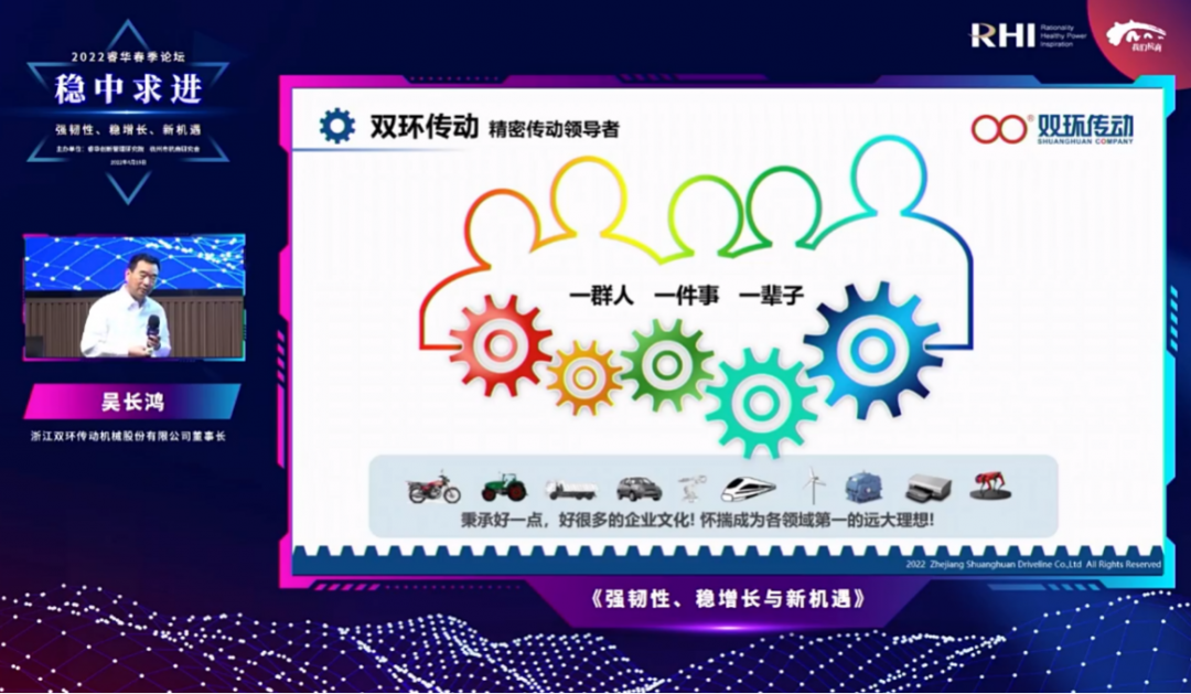 在主旨演讲环节,吴董从企业与产品、企业内部创新、市场巩固和发展同心多元化四个方面出发,向线上线下观众传递了双环理念和精神。